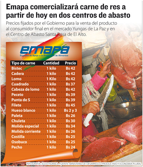 La Empresa de Apoyo a la Producción de Alimentos (Emapa) empieza desde hoy la comercialización de carne de res a “precio justo” en el mercado Yungas de La Paz y en el Centro de Abasto Santa Rosa de El Alto. Inicialmente se pondrán a la venta 12.500 kilos (12,5 toneladas).