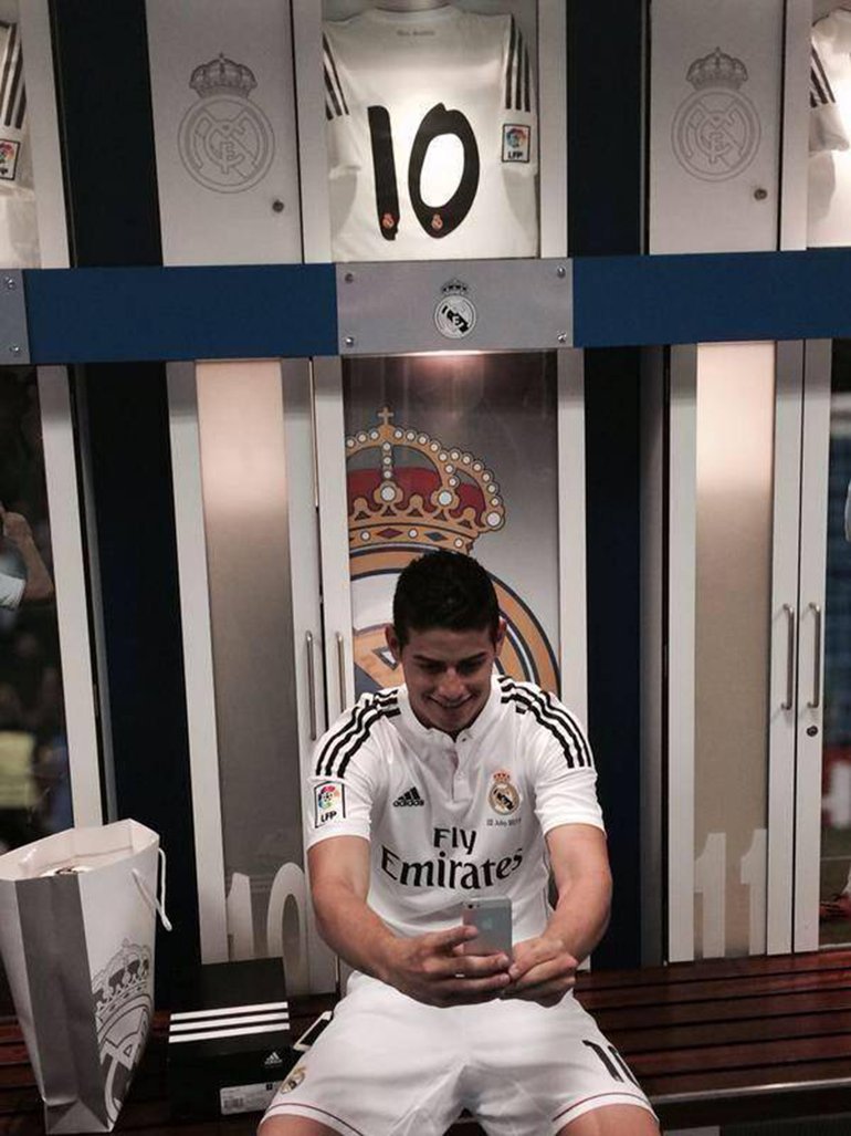 Una vez cumplido su sueño de fichar por el conjunto del Real Madrid, James Rodríguez se tomó la “selfie” que seguramente tenía tiempo esperando: En el vestuario del Real Madrid y con la elástica merengue.