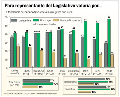 Según el Mapa 2014 de las Mujeres en Política publicado por Naciones Unidas, Bolivia se encuentra en el puesto 33 de un estudio de 189 países en torno al número de ministras en el Gobierno, mientras que en Legislativo se encuentra en el lugar 51.