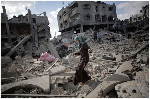 Una mujer camina entre las ruinas en Gaza. Foto: hoy.com.do