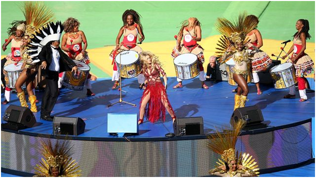 El «la, la, la», estribillo de la canción «Dare» de la cantante colombiana, causó un bramido en las gradas del estadio carioca, que estaba a media capacidad cuando Shakira hizo irrupción en el escenario, en el centro de una inmensa bandera brasileña tendida sobre el césped.