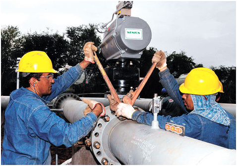 Transporte. Dos técnicos ajustan una tubería del GIJA en mayo de 2011. AFKA-Archivo.