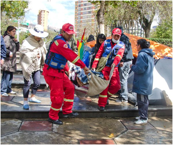 Al promediar las 10.45 de ayer efectivos de la Unidad Operativa de Bomberos se presentaron en la plaza Abaroa de la ciudad de La Paz, donde se encuentra el piquete de huelga de hambre de familiares del suboficial Jhonny Gil. En el lugar Roberta Leniz fue evacuada en una camilla de tela, cubierta por una frazada.