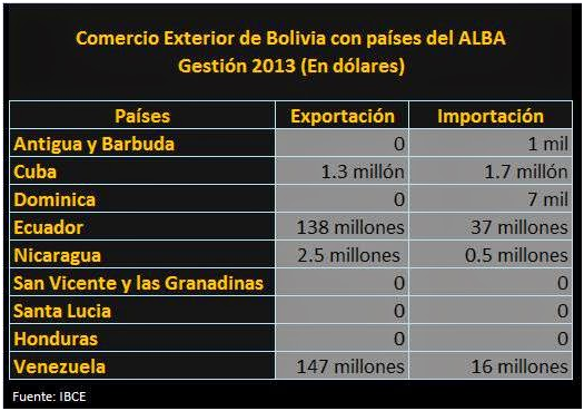 Rodríguez señaló que en 2013, Bolivia exportó sólo 289 millones de dólares al bloque del ALBA de un total de 12 mil millones vendidos, gracias a países como Venezuela y Ecuador. Dijo que en general los países del ALBA, de acuerdo a información del INE, prefieren realizar negocios de importación y exportación con Estados Unidos que entre ellos.