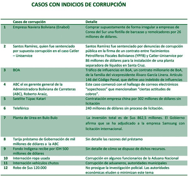 CASOS CON INDICIOS DE CORRUPCIÓN NO INVESTIGADOS EN YPFB, BOA, SATÉLITE, TELEFÉRICO ADEMÁS DE OTROS, COMO LA COMPRA DE BARCAZAS CHINAS Y EL ROBO AL BCB, GOLPEAN LA CREDIBILIDAD DE LA ACTUAL ADMINISTRACIÓN.