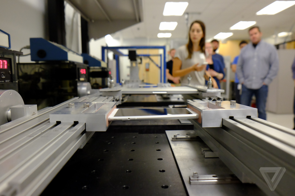 Como podemos ver en las imágenes de la galería, los chicos de The Verge tuvieron acceso a dicho centro de pruebas. Ahí los iPhone 6 son sometidos a distintas pruebas. Como aplicar presión en el terminal por la parte frontal, una presión que simula cuando nos sentamos encima del terminal al traerlo en los bolsos traseros. Apple dice que ellos han aplicado una presión de hasta 25 kilogramos para ver si el iPhone 6 se dobla o no. También hay una prueba similar, pero esta simula como si nos sentáramos arriba del iPhone, en una superficie dura y plana, lo cuál es lo peor que podríamos hacer. También está otra prueba que aplica presión sobre el iPhone 6 por la parte trasera y en justo a la mitad del terminal, mientras que las partes superiores están puestas sobre unas barras, dejando así el centro del terminal en el aire, todo eso para ver cuánta presión se necesita para doblar por la mitad al equipo.