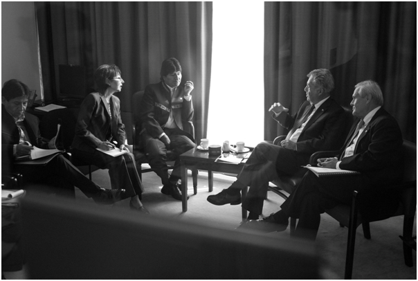 En el último día de su visita a Nueva York, donde se inauguró el 69 período de sesiones de la Asamblea General de NNUU, y donde el líder boliviano galvanizó la Conferencia Mundial sobre Pueblos Indígenas y la Cumbre del Clima 2014, se reunió por separado con Hollande y Fischer en el hotel del primero y las oficinas del segundo en el edificio del organismo multilateral.