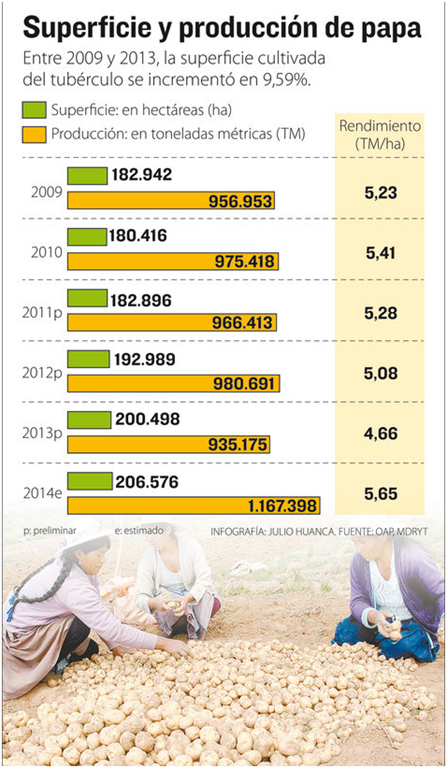 El Gobierno proyecta que este año la producción de papa se incrementará en 24,83% respecto a 2013, debido a la elevación del precio que genera ganancias para el productor y el aumento en el rendimiento de la producción. El viceministro de Desarrollo Rural y Agropecuario, Víctor Hugo Vásquez, dijo que este año la producción de papa será de 1,1 millones de toneladas métricas (TM), 24,83% más que en 2013 (935.175 TM). En 2012, llegó a 980.691 TM.