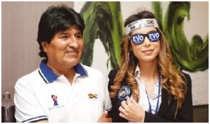 La instantánea muestra a Morales y Jordan posando con distintivos del MAS con un cintillo en la cabeza con la leyenda «Generación Evo”, unos anteojos con el vocablo «Evo” y un botón con el rostro del candidato Evo Morales.
