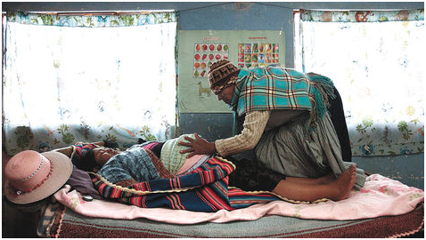 Una partera frota el vientre de una pobladora del municipio de Patacamaya, en el altiplano paceño. Foto La Razón.