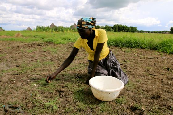 Una mujer escarba en el terreno para recoger hierbas para alimentar a sus hijos, en Kiech Kuon. / Unicef
