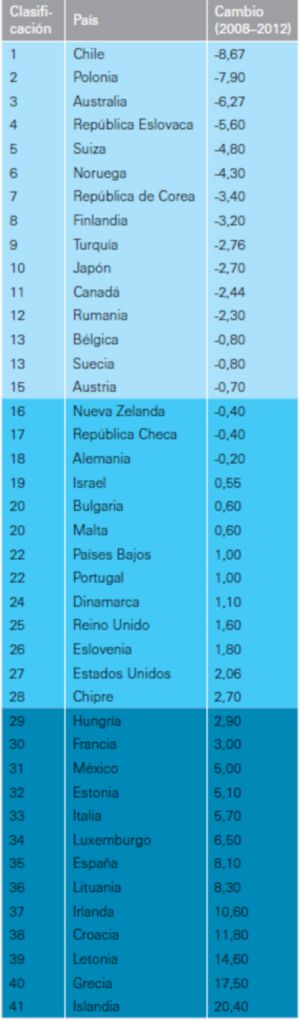 Combinados los datos de pobreza y privaciones materiales, se observa que sube el número de niños que sufren ambas circunstancias. Destaca el ejemplo de Grecia. Entre los 23 millones de pobres y los 10,4 con privaciones, 6,1 millones estaban en ambas listas en 2008. Cuatro años después, con 40,5 millones de menores pobres y 20,9 con privaciones, 18 millones eran ambas cosas. Son 11,9 millones más.No es casualidad, advierten los investigadores, que los peores datos se registren mayoritariamente en el sur de Europa, donde se han realizado importantes ajustes fiscales y recortes en prestaciones sociales. “Los países de la OCDE y muchos otros dieron el paso de adoptar paquete de estímulo en la fase inicial de la crisis. No obstante, la persistencia de la recesión provocó una caída de los ingresos nacionales y un aumento significativo del déficit, y la creciente presión de los mercados financieros obligó a muchos gobiernos a efectuar recortes presupuestarios. El giro fue especialmente abrupto en la eurozona”, analiza el organismo.Frente a las políticas de austeridad en general y para la protección de la infancia en particular, países como Chile, Japón o Suecia reforzaron el sistema de protección, e incrementaron las ayudas o aprobaron nuevas. Así, Unicef alaba la decisión del país latinoamericano de subir la bonificación por maternidad, así como la asignación familiar a las que están en situación de pobreza extrema. Ha reducido así su tasa de pobreza infantil en 8,7 puntos, pasando del 31,4% en 2008 a 22,8 en 2012. “Gastó el doble que México, que partía de una situación parecida, en el paquete de estímulo”, compara el documento. Por eso, continúa, el país centroamericano ha visto incrementado su porcentaje de menores en riesgo de 29,3% a 34,3% (cinco puntos más).