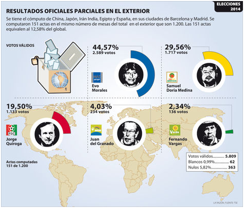 Según datos oficiales preliminares, al 12,58%, el MAS ganó también en los comicios celebrados en 33 países. El partido de Evo Morales obtuvo 44,57%, frente a 29,56% de la alianza de Samuel Doria Medina, que consiguió el segundo lugar.