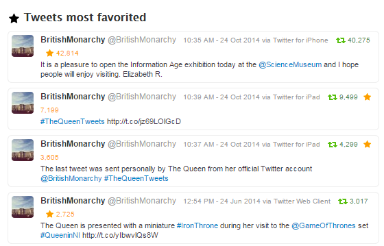 El gesto simbólico de la Reina fue muy apreciado por la comunidad tuitera británica, traduciéndose en 117.716 nuevos seguidores en apenas 2 días (25 y 26 de octubre), ampliamente superando el ritmo de crecimiento diario (2000) que venía registrando esta cuenta.