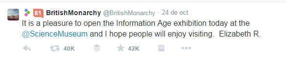 El pasado 24 de octubre la Reina de Inglaterra, a los 88 años, envió su primer trino, con motivo de la inauguración de la galería de la era de la información en el Museo De Ciencias de Londres.