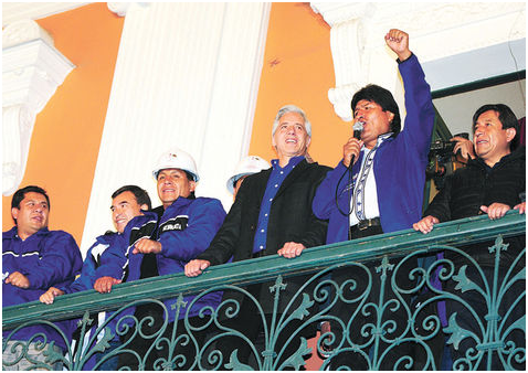 Aproximadamente a las 21.10, el presidente Evo Morales, candidato del Movimiento Al Socialismo (MAS), apareció en el balcón principal del Palacio de Gobierno y saludó a los centenares de militantes de su partido congregados en la plaza Murillo para festejar la victoria anunciada por las encuestas. Y casi al final de su discurso, convocó a los opositores a trabajar por Bolivia.