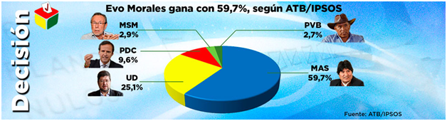 Hay tres factores fundamentales para el triunfo de Evo Morales y su reelección en primera vuelta para los próximos cinco años en Bolivia. El primero es la estabilidad y el crecimiento económico de un imaginario de bonanza económica; esto es muy importante para la estabilidad económica que sienta las bases para una estabilidad política que se vive en el país.