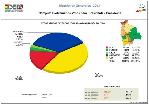 Hasta horas de la mañana la página web del TSE reportaba resultados hasta el 2,89 por ciento de las actas de cómputo, dando al MAS el 34,96 por ciento de los votos, mientras que UD alcanza el 43 por ciento, el PDC, 16,86 por ciento; MSM 2,22 por ciento y al PDV el 2,53 por ciento.
