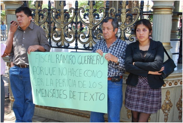 El abogado (izq), el padre y la hermana de Cristian Osvaldo Mariscal en una protesta en la ciudad de Tarija. Foto archivo El País.