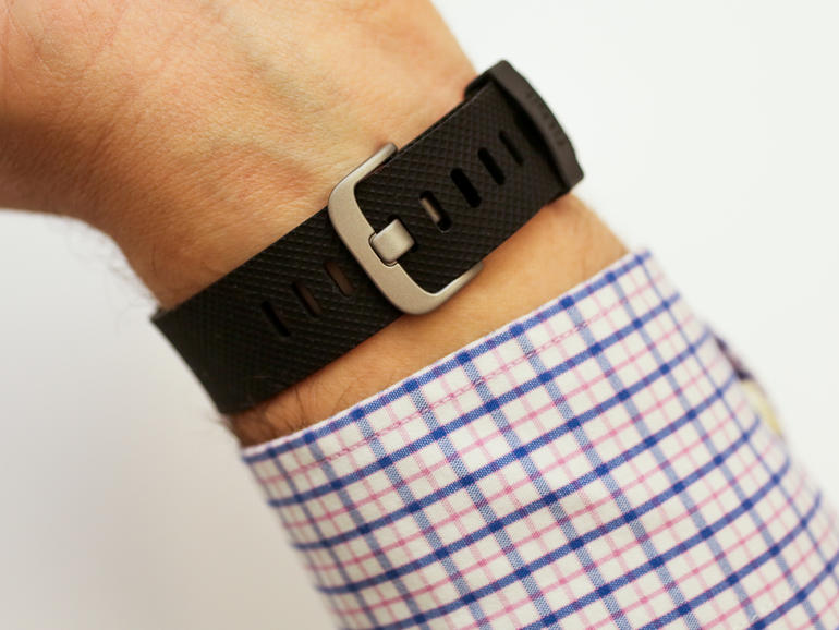 Incluye una correa estándar de reloj que se cierra firmemente, aunque el diseño del Surge es un poco más ancho que el de otros relojes.