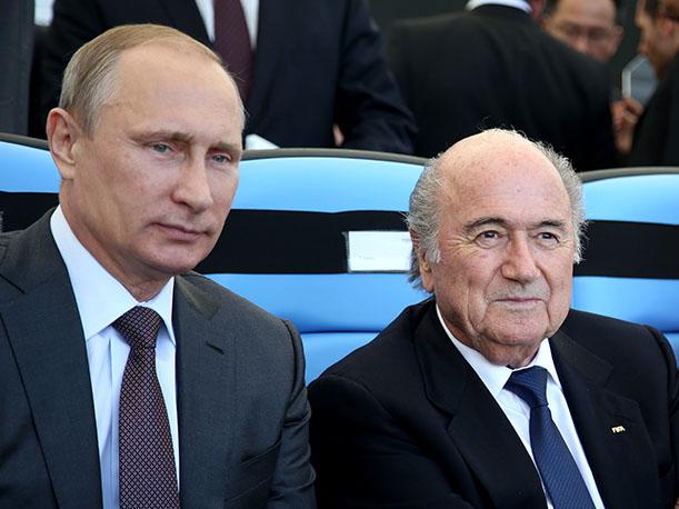 vladimir-putin-joseph-blatterEl presidente de la FIFA, Joseph Blatter, llegó a Moscú para la presentación del logotipo oficial del Mundial Rusia 2018.