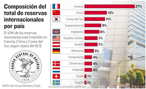 Según el reporte Administración de las Reservas Internacionales Primer Semestre 2014, publicado en la página web del BCB, el 27% de las RIN se encuentran invertidas en Francia, el 12% en China, el 11% en Corea del Sur y el restante 50% en otras naciones, incrementando la diversificación por país en relación a diciembre de 2013.