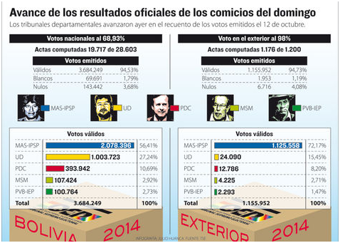 El recuento oficial de los votos subió ayer en sus indicadores parciales (68,93%) tras la llamada de atención de los observadores de la Organización de Estados Americanos (OEA), del presidente Evo Morales y actores de la oposición. Al 68,93% del proceso oficial, el Movimiento Al Socialismo (MAS) llegó al 56,41% de los votos de las actas escrutadas a escala nacional. El conteo rápido de Ipsos proyectó que Morales ganaría con el 59,7% del respaldo ciudadano.