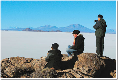 Disfrutando. Turistas observan la inmensidad del salar de Uyuni. Al fondo, la silueta del volcán Tunupa. Foto archivo La Razón.