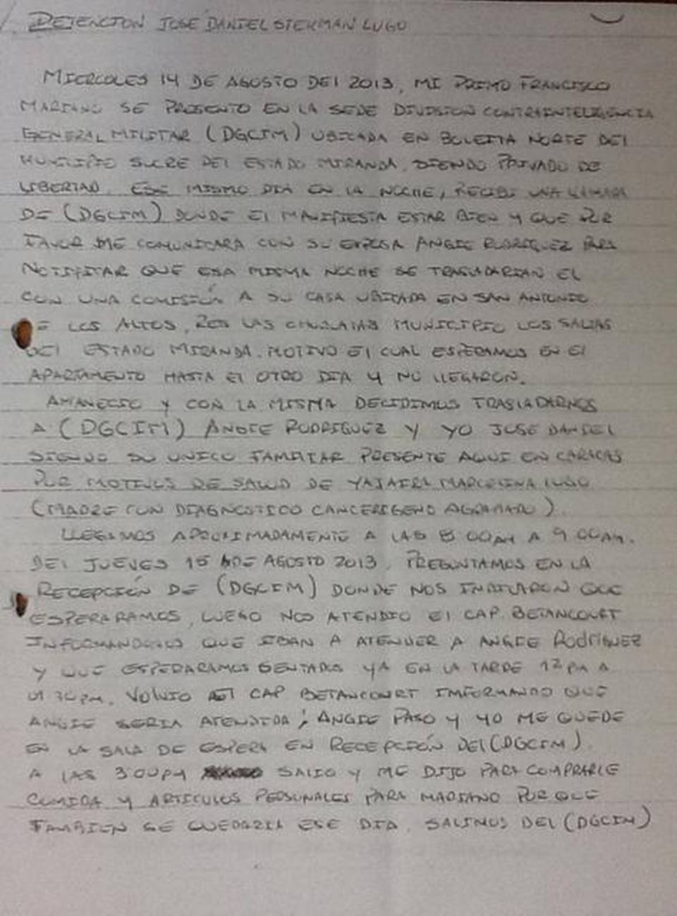 El relato forma parte del testimonio escrito a mano por José Daniel Stekman Lugo, quien fue interceptado a mediados de agosto del 2013 por cuatro hombres que luego lo torturaron para obligarlo a confesar dónde estaban el el dinero y los autos de su tío. Pero sus agresores no eran delincuentes comunes sino agentes de la Dirección General de Contrainteligencia Militar de Venezuela (DGCIM).
