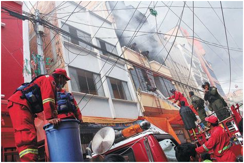 La Paz. Personal de Bomberos junto a policías ayudan a sofocar el fuego en el edificio de la zona comercial. Eduardo Schwartzberg. Foto archivo La Razón.