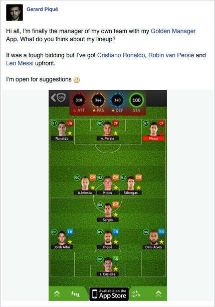 «Amor, ¿qué haces poniendo a Leo Messi en la banda derecha? Sabes que es delantero centro, ¡despierta!», escribió Shakira en la publicación de Facebook. Sin embargo, Gerard Piqué no dudó en responderle a su pareja, también a través de Facebook, a quien le dijo que no se preocupara porque todo era parte de su estrategia. Asimismo, Shakira también se atreve a influir en las decisiones de su pareja con respecto a su carrera profesional fuera de las redes sociales.