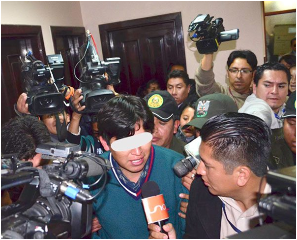 EL PEDIATRA EN MEDIO DE LOS MICRÓFONOS Y SU ESCOLTA QUE LO LLEVÓ A SU RECLUSIÓN EN SAN PEDRO.