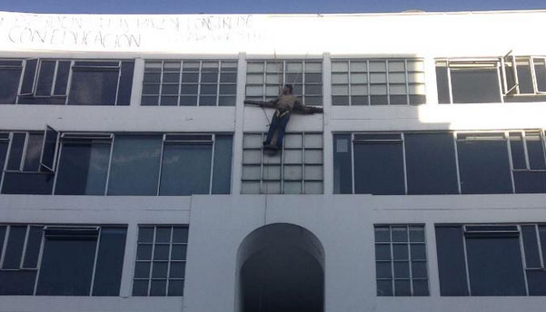 El presidente del Consejo Estudiantil de la San Martín, Cristian Sánchez, se amarró a una cruz colgada de cuerdas en la parte externa del piso ocho del edificio universitario, lo que obligó a las autoridades a pedir ayuda al Cuerpo de Bomberos para retirarlo de las alturas.