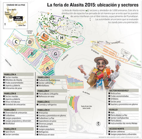 La feria de Alasita 2015 se inaugurará en una ceremonia que se realizará hoy en el Palacio de Gobierno, una de las paradas de la procesión que llevará a la illa del Ekeko Tunu de El Alto hasta el Parque Urbano Central paceño. El recorrido comenzará a las 05.00 en el Polifuncional de la Ceja. “Este recorrido está pensado para demostrar la importancia que tiene la illa, que va más allá de su valor como pieza arqueológica. Es un símbolo de fe y creencia en las tradiciones de nuestros pueblos”, definió el ministro de Culturas, Pablo Groux.