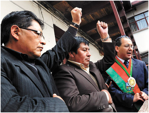 imageMilitancia. Rocha posesiona a Julio Tincuta (centro) como subalcalde de Periférica, quien hace la señal del MAS. Ángel Illanes.