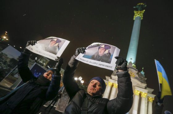 Manifestantes ucranios en una protesta, ayer en Kiev. / SERGEY DOLZHENKO (EFE)