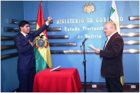 Ref. Fotografia: Ministerio de Gobierno. El lunes, Hugo Moldiz tomó el juramento al viceministro Jorge Pérez.