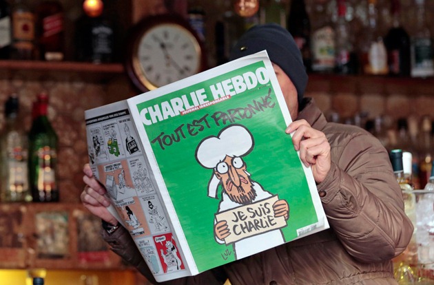 Representa a Mahoma con una pancarta “Je suis Charlie”, el lema de millones de manifestantes que desfilaron en Francia y en el extranjero contra los ataques yihadistas que causaron 17 muertos en París. Algunos musulmanes han condenado el dibujo.