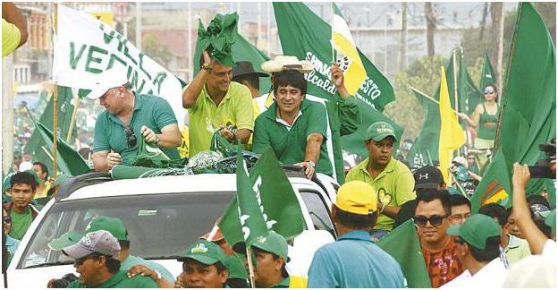 Encima de la camioneta, el líder de UD, Ernesto Suárez, junto al postulante a la Gobernación del Beni por NACER, Carlos Dellien, ayer en una caravana en Trinidad. AFKA.