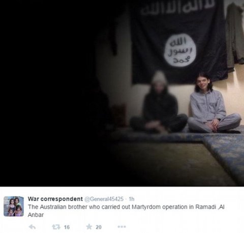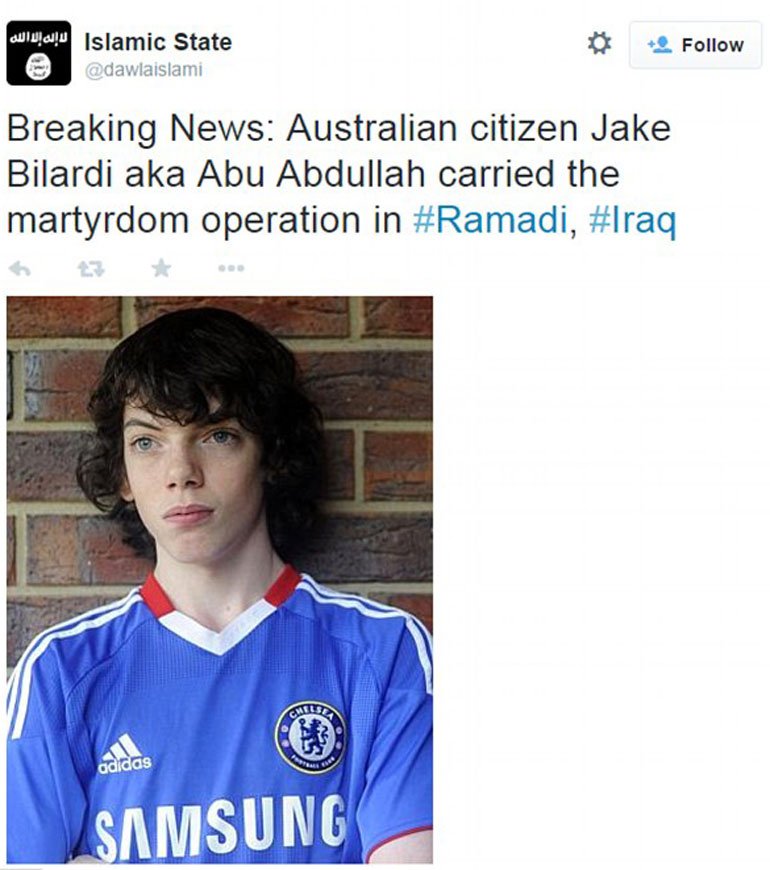 «Noticia urgente: el ciudadano australiano Jake Bilardi alias Abu Abdullah llevó a cabo la operación de martirio en #Ramadi, #Irak», escribió el usuario de Twitter que se identifica con una bandera del Estado Islámico y cuya cuenta es @dawlaislami.