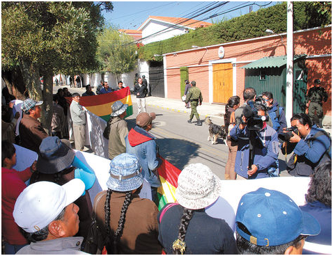 Movilización. Choferes y sus familiares protestan frente a las puertas del Consulado de Chile, en Calacoto. Ignacio Prudencio.