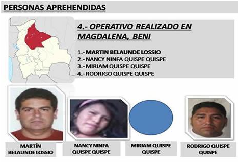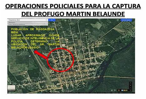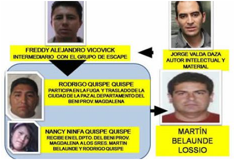 El Deber Digital, La PazimagePersonas vinculadas a la fuga de Martín Belaunde Lossio. (Fuente: ministerio de Gobierno)El Fiscal General del Estado, Ramiro Guerrero, afirmó que la fuga del ciudadano peruano Martín Belaunde Lossio costó cerca de un millón de dólares, pagados entre las personas que lo trasladaron y ocultaron. Se apunta principalmente a su abogado en el país, Jorge Valda.»De cerca de un millón de dólares. Estamos investigando a que niveles llegó. Hay algunos indicios de que el dinero se distribuyó entre algunos vocales del Tribunal Departamental de Justicia de La Paz y magistrados del Tribunal Constitucional, pero estamos investigando», señaló en conferencia de prensa en Sucre.Ratificó que una comisión de fiscales viajará a Lima-Perú para tomar las declaraciones al exasesor de Ollanta Humala por el delito de evasión al escapar de un domicilio en el que guardaba detención domiciliaria y también vinculó a algunos funcionarios de la Dirección de Migración.»Se han aprehendido a más de 13 personas, a algunos familiares, a algunos abogados que fueron parte del propio operativo, de pagos y sumas, de gente que lo trasladó y ocultó en su domicilio», señaló la autoridad.Explicó que dos personas ya se sometieron a un proceso abreviado, un abogado de Santa Cruz y un ciudadano de Magdalena-Beni, recibiendo condenas de tres años. «El abogado Valda ya tiene dos antecdentes de fuga, uno con el señor Róger Pinto y otro de Humberto Roca», recordó.Sobre su captura«¿Cómo se llama? ¿Cómo se llama?», le pregunta un uniformado al empresario al momento de su captura, según una grabación que fue presentada por el Gobierno. En ella se advierte la forma en la que los policías lo sacan de un domicilio en la población de Magdalena.Vestido con una polera negra y un short, descalzo y con las manos enmanilladas, así los efectivos lo sacan de una casa que se encontraba próxima al mercado central de la población del departamento del Beni.Los detalles de su fuga:imageRuta de fuga que siguió Martín Belaunde Lossio entre La Paz y Beni. (Fuente: ministerio de Gobierno)imagePersonas vinculadas a la fuga de Martín Belaunde Lossio (Fuente: ministerio de Gobierno)imagePersonas vinculadas a la fuga de Martín Belaunde Lossio (Fuente: ministerio de Gobierno)imagePersonas vinculadas a la fuga de Martín Belaunde Lossio (Fuente: ministerio de Gobierno)imageZona del operativo realizado por la Policía para la captura de Belaunde. (Fuente: ministerio de Gobierno)
