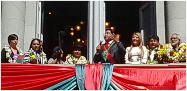 Tras la posesión, el nuevo alcalde se dirigió al Palacio Consistorial y desde un balcón saludó a los paceños junto a los concejales de Sol.Bol y también del MAS. Mañana, Revilla será posesionado en el Concejo Municipal, en su primera sesión.
