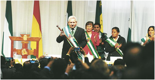 Luego del discurso de Lozada, Costas ingresó al salón acompañado de su esposa, Sonia Vincenti, enfundado en un traje negro y con una corbata verde pacay en el cuello. Saludó, abrazó y subió a ocupar su lugar -el semitrono de madera bien pulida- en medio de los asambleístas. Pronto juró, hizo la señal de la cruz, frente a Kathia Quiroga, y se puso la banda tejida por guaraníes, la medalla del gobernador español y él tomó el cetro que lleva parte del mártir igualitario.