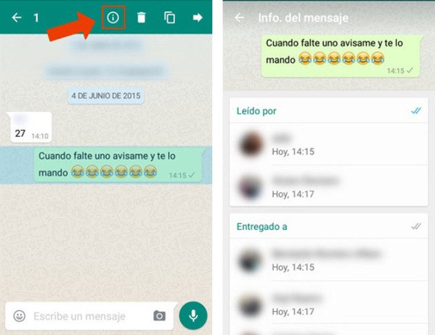 Tal y como nos detallan en Android Ayuda, una vez hayamos escrito un mensaje en grupo tan solo tendremos que marcar dicho mensaje con una pulsación prolongada con el dedo. Acto seguido aparecerá una serie de iconos en la parte superior de la interfaz. Nos referimos a aquellos que nos permiten compartir contenidos, copiar mensajes e incluso borrarlos. El que nos interesa está justamente al lado de la papelera, un signo formado por un círculo que rodea a una i latina. Tan solo tendremos que pulsarlo y acto seguido se listan los integrantes del grupo filtrados en orden según hayan leído, recibido o no recibido el mensaje. En esta ocasión vemos que el mensaje no solo ha sido recibido a las 14:15, sino que también ha sido leído de inmediato. Aquellos que no lo hayan leído tan solo figurarán como entregado.