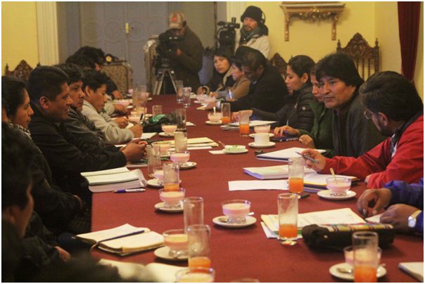 imageDomingo 07 de junio de 2015. El presidente Evo Morales se reúne esta mañana en la casa de gobierno con el Consejo de Federaciones Campesinas de los Yungas de La Paz COFECAI .(fotos Enzo De Luca)    La Paz, 7 jun (ABI).- El presidente Evo Morales comprometió el domingo financiar la compra de un inmueble para el Consejo de Federaciones Campesinas de los Yungas de La Paz (Cofecay) y la Asociación Departamental de Productores de Coca de La Paz (Adepcoca).El secretario ejecutivo de Cofecay, Eloy Mita, después de participar de una reunión con el Jefe de Estado y representantes de esas organizaciones sociales en Palacio de Gobierno, precisó que el costo de ese inmueble demandaría al menos «400.000 dólares».»Quiero anunciar que el hermano Presidente nos va a hacer la compra del inmueble para la Casa Grande de Cofecay y Adepcoca con un monto de 400 mil dólares», dijo en  una breve conferencia de prensa.El dirigente explicó que tanto Cofecay como Adepcoca utilizan oficinas alquiladas en la ciudad de La Paz, razón por la que se proyecta adquirir un inmueble propio.Mita informó que en esa reunión con el Presidente también se abordaron temas importantes para ese sector y la región de Yungas como la construcción del hospital del norte, caminos, tinglados y la instalación de una fábrica de miel.Además, de la implementación de un centro de innovación y de un instituto tecnológico, proyectos que «ya tienen avance».Por su parte, el presidente de Adepcoca, Ernesto Cordero, manifestó su agradecimiento al Mandatario y resaltó su interés por el desarrollo de esa región, en especial con la construcción y equipamiento del hospital del norte.»Este tema hemos tocado en coordinación con la hermana Ministra  de Salud y yo sé que estamos todos los Yungas contentos y felices y muchos temas más por el que también estamos muy agradecidos al Presidente y siempre hemos venido a dar respaldo», manifestó.
