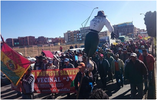 Decenas de vecinos salieron la mañana de este lunes al centro de la ciudad de El Alto para apoyar a la alcaldesa y exigir el cambio de los dirigentes. Con un muñeco de trapo, con el nombre de Óscar Ávila, los vecinos marcharon por la avenida principal, la 6 de marzo, que conecta con la autopista La Paz-El Alto. Posteriormente se apostaron frente a la sede de la Fejuve exigiendo la renuncia de Ávila.