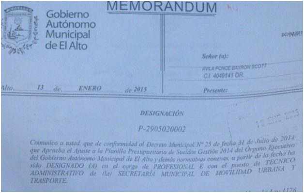 El memorándum de designación del hijo del presidente de Fejuve. Foto: ANFANF y Página Siete / La Paz.- En medio de las presiones de la Federación de Juntas Vecinales (Fejuve) contra la alcaldesa Soldad Chapetón, se reveló que Bayron Ávila, hijo de Oscar Ávila, presidente de esta organización, trabaja en el gobierno municipal de El Alto según un memorándum de designación del 13 de enero de 2015.Fue designado en el cargo de «técnico administrativo de la Secretaría Municipal de Movilidad Urbana y Transporte»; el memorándum fue firmado por Juan Mamani, director de Capital Humano del Gobierno Municipal de La Paz, y divulgado por el asambleísta departamental de Unidad Nacional, Marco Antonio Fuentes.El miércoles fueron divulgadas cartas en las que se demuestra que diversos sectores tiene la potestad de sugerir nombres de funcionarios de la Alcaldía. El presidente de la Fejuve dijo que su hijo es técnico en computación y que si fue contratado es porque cumplió los requisitos y negó haber influenciado en el nombramiento.»Yo no sé cómo mi hijo habrá obtenido ese cargo, antes estaba a contrato y ahora lo han debido contratar en planilla, pero yo no he ejercido influencia en ese nombramiento», declaró a radio Panamericana. Ávila insistió que los subalcaldes sean nombrados por «usos y costumbres y que los ya nombrados por Chapetón asistan a las asambleas de los dirigentes vecinales para ser ratificados.Chapetón fue elegida con el 54,4% de los votos, pero esta semana, tras designar a los subalcaldes distritales, la Fejuve se declaró en emergencia y amenazó con iniciar desde la próxima semana un paro general en rechazo a las designaciones. La Fejuve defiende «la tradición» de haber designado a ternas de candidatos para esos cargos desde hace 16 años.Chapetón dijo que ello ha corrompido la relación entre autoridades y juntas de vecinos y que no aceptará presiones para sus designaciones. Paralelamente, el asambleísta departamental Fuentes, denunció que las presiones de Fejuve encubren el «cuoteo» de esta organización en la Alcaldía de El Alto, razón por la que los dirigentes no quieren perder estos privilegios. «¿Qué defiende este dirigente Ávila y otros? ¿Defienden los intereses legítimos de la ciudad o están defendiendo estos espacios o cuotas de poder que ellos atribuyen a los usos y costumbres? Lo cierto es que estas subalcaldías se han vuelto botines políticos de algunos dirigentes», declaró el asambleísta departamental.Cartas. ANF accedió a cartas de la Federación de Juntas Vecinales (Fejuve), Consejo de Autoridades Indígenas Originarias Julián Apaza y Junta Distrital 3 de Unidades Educativas dirigidas al exalcalde Zacarías Maquera y a otras autoridades demandando «la contratación» de varias personas, en algunos casos de manera imperativa. Las misivas se enviaron incluso cuando las anteriores autoridades estaban a punto de dejar sus funciones, en abril y mayo pasados, y cuando el Tribunal Supremo Electoral y departamental ya habían proclamado como ganadora de los comicios a Chapetón.