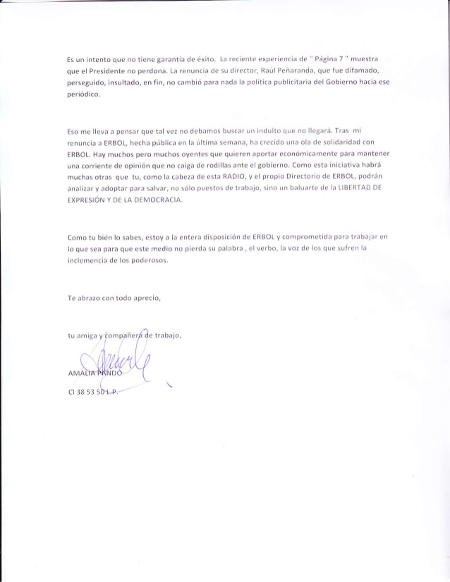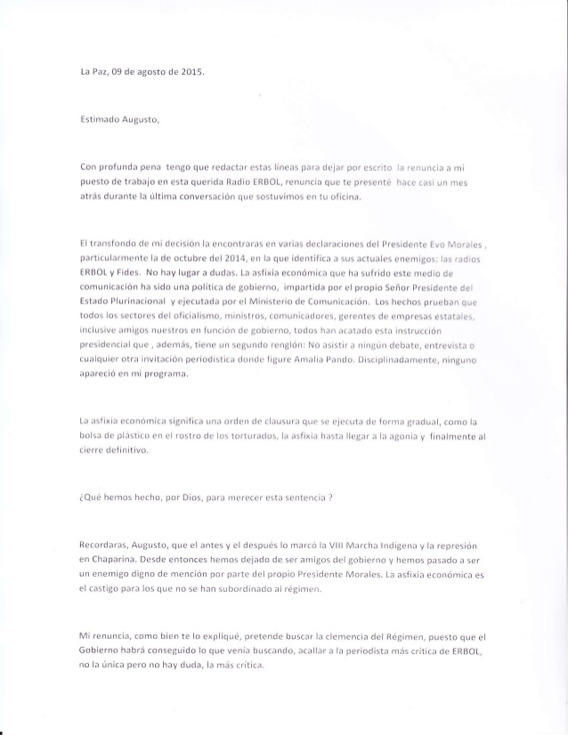 “Con profunda pena tengo que redactar estas líneas para dejar por escrito la renuncia a mi puesto de trabajo en la querida Radio ERBOL”. Así inicia la nota en que la periodista Amalia Pando comunica su renuncia al Director de este medio de comunicación, Augusto Peña.En su carta, Pando indicó que ERBOL ha sufrido una “asfixia económica” por parte del Gobierno, “impartida por el Señor Presidente del Estado Plurinacional y ejecutada por el Ministerio de Comunicación”.“La asfixia económica significa una orden de clausura que se ejecuta de forma gradual, como la bolsa de plástico en el rosto de los torturados, la asfixia hasta llegar a la agonía y finalmente al cierre definitivo”, escribió.Para la periodista, esta actitud del Gobierno “es un castigo para los que no se han subordinado a régimen” y reveló que su renuncia “pretende buscar la clemencia del Régimen”.En el programa La Mañana en Directo de ERBOL, Pando calificó de discriminatoria la actitud del Ejecutivo de dar publicidad a lo que los aplauden y nada a los que tienen una voz crítica.“El Gobierno cuando aprueba su plan de publicidad cree que está comprando conciencias. No es que cree, está comprando conciencias y Erbol no estaba a la venta”, manifestó.La entrevistadora explicó que hay empresarios venezolanos, “que no los conocemos”, como dueños de los más importantes medios de comunicación “otrora opositores, hoy leales al Régimen”.“Los medios que no se los ha podido comprar, los ha condicionado a través de la publicidad, cosa que está penada por la Convención Americana de los Derechos Humanos y por la Declaración de Chapultepec”, señaló.La Declaración de Chapultepec dice que “la concesión o supresión de publicidad estatal, no deben aplicarse para premiar o castigar a medios o periodistas”.