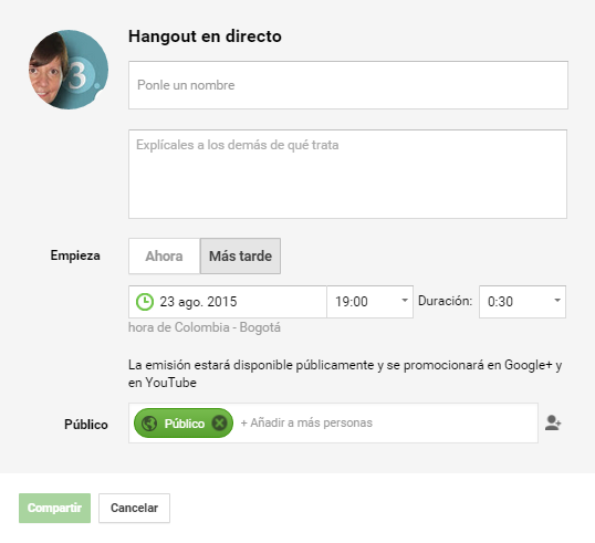 Una vez seleccionada la opción de “Hangouts en directo”, se desplegará un menú que pide toda la información sobre el evento, tal como: Título, descripción del tema a desarrollar y audiencia. Adicionalmente permite comenzar el Hangout inmediatamente o programarlo para otro momento.